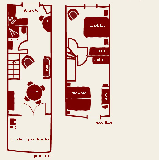 Upper floor: 2 bedrooms (1 x double-bed 5.24ft x 6.5ft; 1 x 2 single-beds 3ft x 6.5ft)