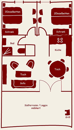 Eingeschossige Wohnungen (3 Zi., ca. 70 m², bis 5 Pers.), entweder Erd- oder Obergeschoss.